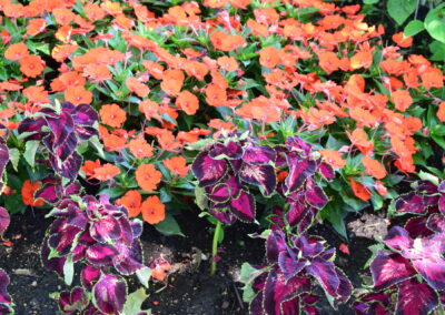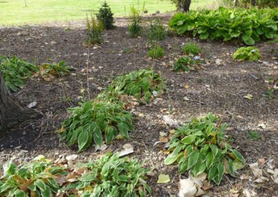 This dry, shady area under a stand of poplar and pine trees contains shade-tolerant perennials and annuals. Perennials planted here include Hosta, Bergenia, Filipendula and Astilbe cultivars. Shade-tolerant annuals such as impatiens and begonias are also planted here as part of the annual flower trials. The garden will evolve as large poplar trees are removed and new, small trees are planted.