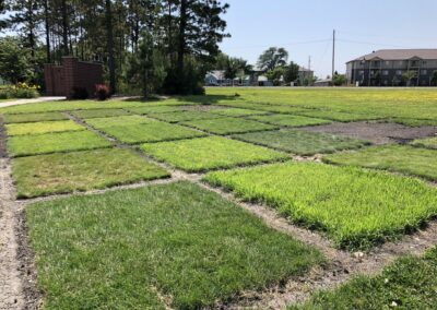 The turfgrass plots are planted with 25 different grass species, mixes, and cultivars. Both cool- and warm-season grasses are represented in the plots. The majority of grasses are meant for full sun or part-sun exposures. However, the fine fescues do well in shaded locations. Many different leaf widths are apparent from fine to very coarse textures. Weedy grasses are also planted to demonstrate their poor qualities. Several plots are planted with pollinator mixes that incorporate low-growing flowers to nourish bees and butterflies.